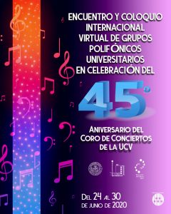 A través de herramientas actuales de tecnología de la información y como un mecanismo para sortear los obstáculos que ha impuesto la pandemia global, la Dirección de Cultura dependencia adscrita al Rectorado de la Universidad Central de Venezuela se prepara para celebrar el 45° Aniversario del Coro de Conciertos UCV, con un Encuentro y Coloquio Virtual Internacional de Agrupaciones Polifónicas Universitarias.