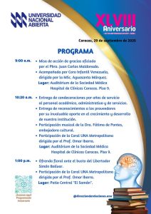 La Universidad Nacional Abierta, realizará actos conmemorativos para celebrar sus 48 años de su creación, en el auditórium de Hospital de Clínicas Caracas, donde las autoridades rectorales, impondrán el próximo lunes 29 condecoraciones a los empleados por años de servicios