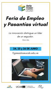 La Feria de Empleo y Pasantías UCAB, tradicionalmente realizada en las instalaciones del campus de la Universidad Católica Andrés Bello en Montalbán, se adapta a las condiciones de distanciamiento social impuestas por la pandemia de la COVID-19.